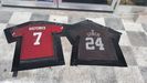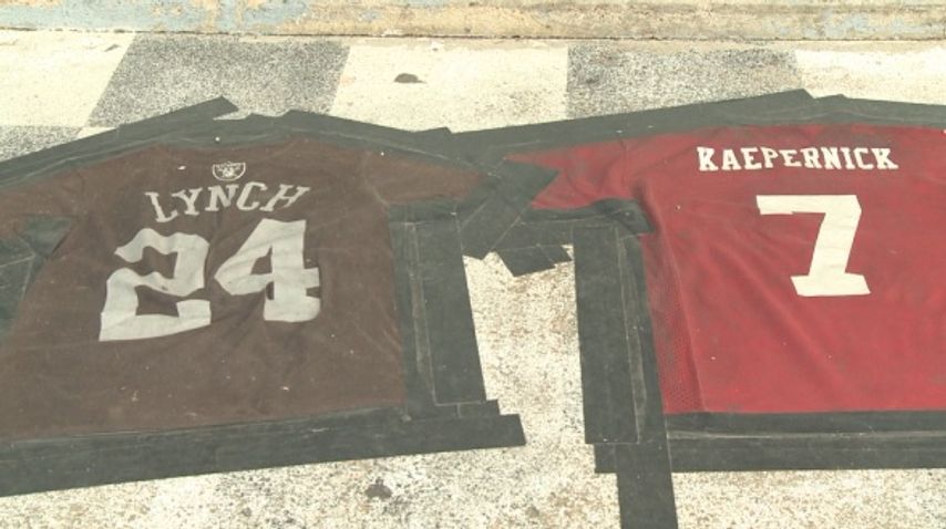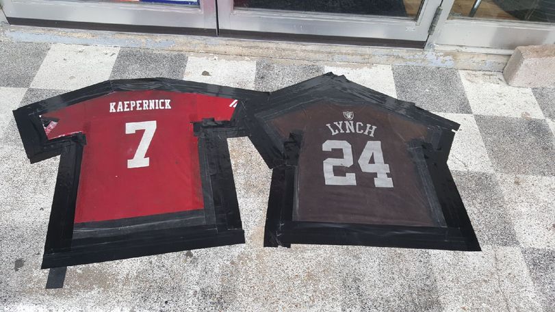 Burle used the jerseys of NFL players Marshawn Lynch and Colin Kaepernick. When placed side-by-side, the jerseys read “Lynch” “Kaepernick."